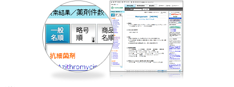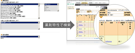 検索方法は多様で、一般名・商品名による検索のほか、当サイト独自の、薬剤特性による検索が行えます。